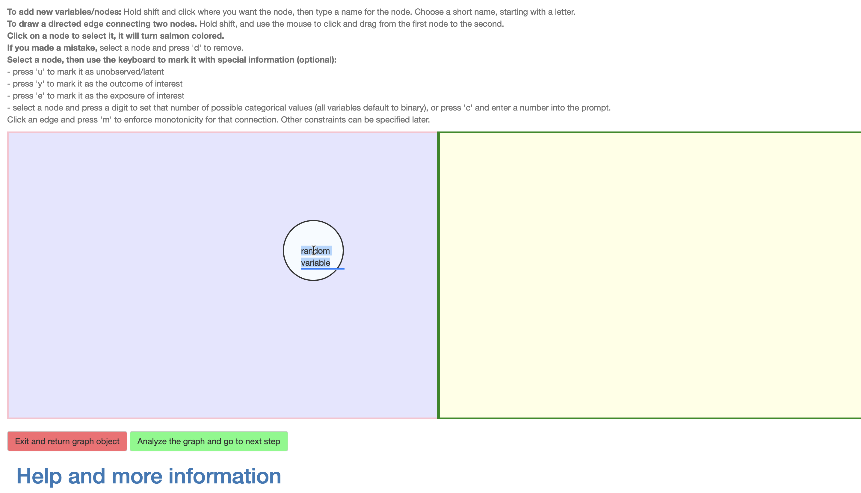 Once the shiny app is launched, the user is presented with an interactive display as shown in Figure 1, in which they can draw their causal DAG. This display is divided into a left side \(\mathcal{L}\) and right side \(\mathcal{R}\) to classify the vertices according to the class of DAGs that the method covers. This division signifies the following: Existence of unmeasured confounding is assumed within each of these sides, but not between them, and any causal influence between the two sides must originate in \(\mathcal{L}\). Generally speaking, the outcome variables of interest will typically be on the right side, things like instruments or randomized treatments will be on the left side, and confounded exposures of interest on the right side. Thus, for the example, we would want to put the instrumental variable on the left side, but the exposure and outcome on the right side. In the web version of this article an interactive version of this interface is shown at the end of this section.
