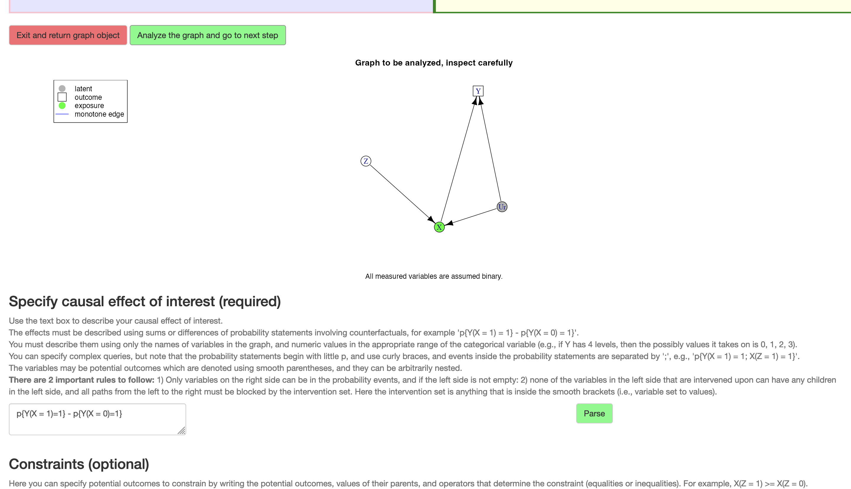 The user is also given the option to provide additional constraints besides those imposed by the DAG. This may be considered an optional advanced feature where, e.g., monotonicity of a certain direct influence of \(Z\) on \(X\) may be assumed by entering \(X(Z=1)\ge X(Z=0)\), with any such extra constraints separated by line breaks. If this feature is used, the input is followed by clicking the button “Parse”, which identifies and fixes them.