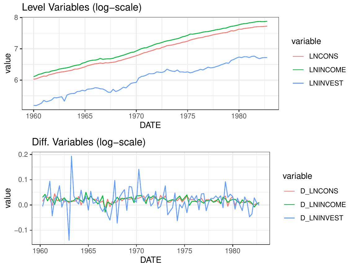 If the explanatory variables are stationary \(\mathbf{A}_{xx}\) is non-singular (\(rk(\mathbf{A}_{xx})=K\)), while when they are integrated but without cointegrating relationship \(\mathbf{A}_{xx}\) is a null matrix.↩︎