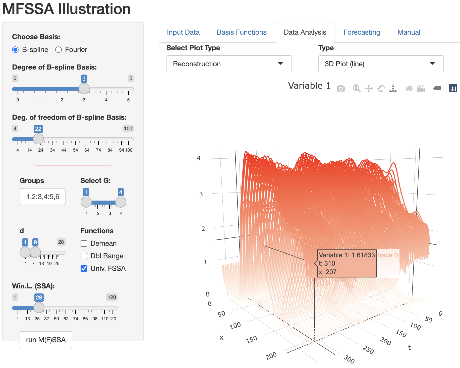 Figure 9 provides a snapshot of the features available in MFSSA shiny-app. In the top of the side bar panel, user may specify the basis functions (B-spline or Fourier) and the associated degrees of freedom to represent the funts object. Those basis functions can be visualized in sub-panel ‘Basis Functions’ under the main panel. The remaining inputs in the side bar will be used in other sub-panels. Specifically ‘Groups’ is an input box for the third step of the MFSSA algorithm. Each group is specified via a vector (e.g. ‘c(1,2,4)’ or ‘1:3’) and separated from other groups with a comma (‘,’). The slider ‘d’ is used to specify the dimensions used in MFSSA (scree, W-correlation, paired, singular vectors & functions, and periodogram plots). The check-box (a) ‘Demean’ is used to subtract the mean to obtain mean-zero functions; (b) ‘Dbl Range’ is used to extend the y-axis to cover all potential mirror functions (e.g. sometime FPCs may get multiply by a negative sign); and (c) ‘Univ. FSSA’ to compare the MFSSA results with marginal FSSA ones respectively. The ‘Win.L.’ slider specify the window lengths for the MSSA and the MFSSA. The ‘run M(F)SSA’ button is used to run MSSA and MFSSA using the specified parameters for the given dataset. In general, for the side bar, the top inputs (above the red line) are mostly to describe the basis functions. The bottom inputs (below the red line) are used to specify SSA and FSSA parameters.